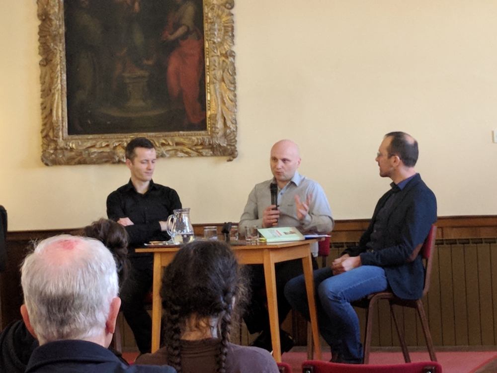Pogovor je potekal v prijetnem in sproščenem vzdušju. Nejc Rožman Ivančič (profesor slovenščine na Gimnaziji v Novi Gorici) in doc. dr. Matej Šekli (višji znanstveni sodelavec na Inštitut za slovenski jezik Frana Ramovša pri ZRC SAZU Ljubljana) sta spoštovanemu gostu izmenično postavljala vprašanja o naslednjih temah: