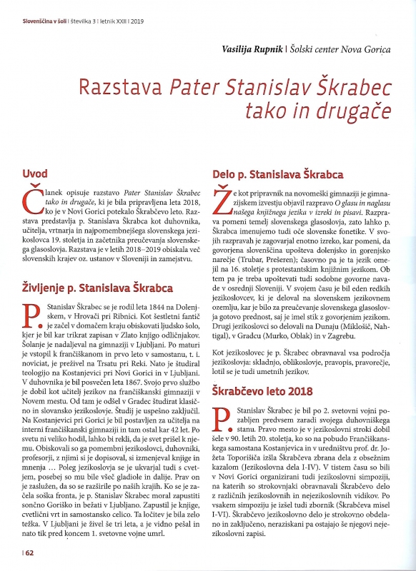 Prispevek ge. Vasilije Rupnik, prof., zaposlene v Šolskem centru v Novi Gorici, objavljen v Slovenščini v šoli, letnik 22, št. 3, str. 62-67, z naslovom Razstava Pater Stanislav Škrabec tako in drugače, je objavljen z dovoljenjem uredniškega odbora revije Slovenščina v šoli. Revijo izdaja Zavod RS za šolstvo.