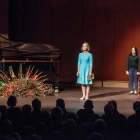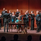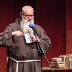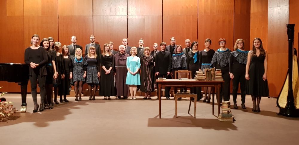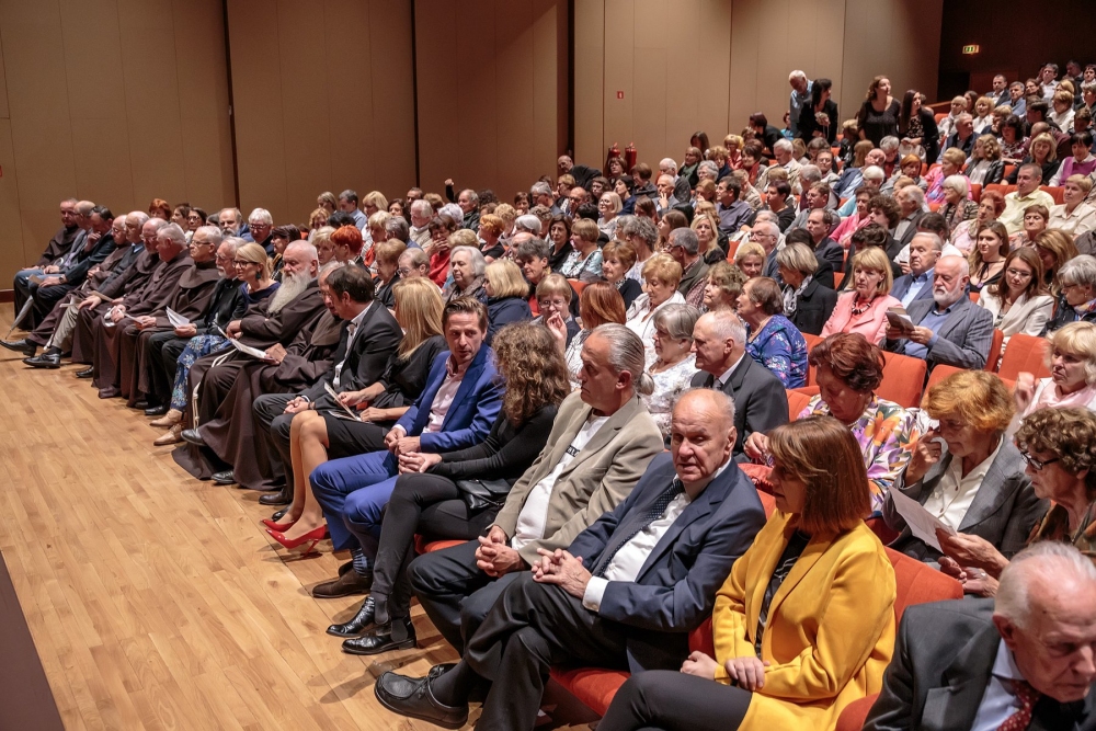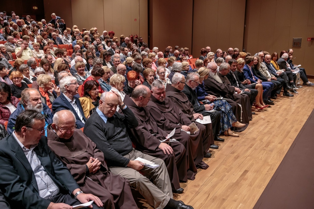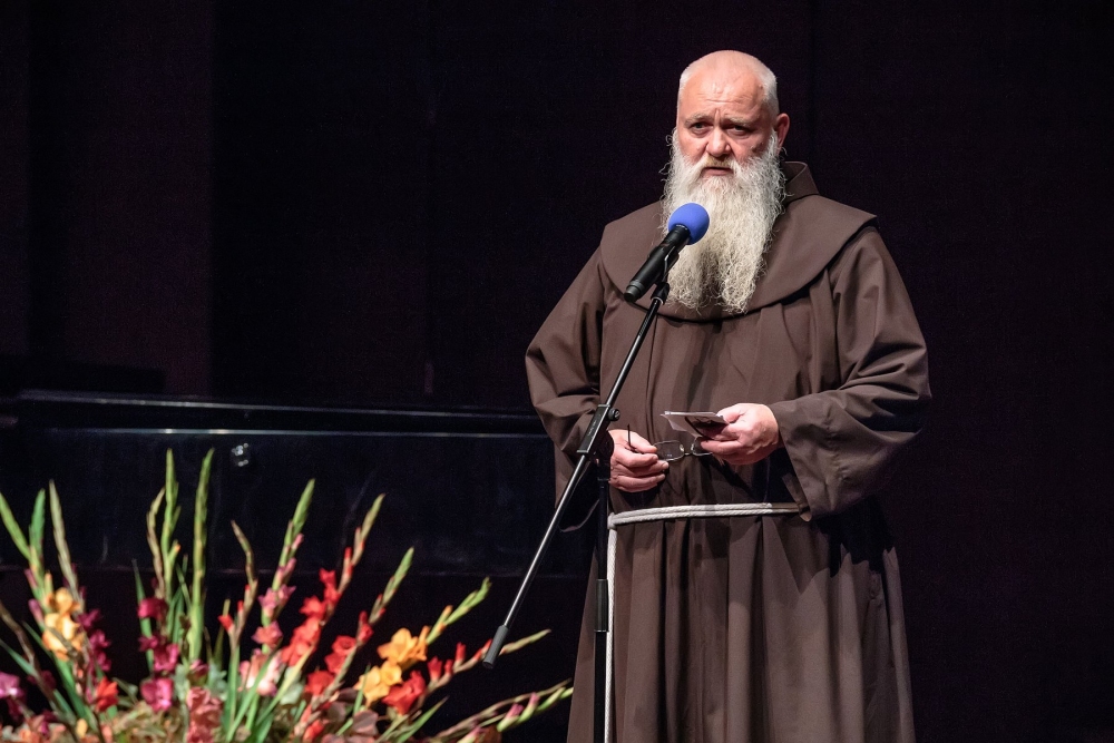 Ura je odbila dvajseto. Z odra je začela prodirati v dvorano umetniška beseda, prepletena z glasbo in nagovori. Nataša Konc Lorenzutti je s svojim igralskim talentom mojstrsko potovala po«glavni cesti« prireditve. Beseda ima veliko moč. To je zelo dobro vedel p. Škrabec in to je s svojim izjemnim talentom pokazala nosilka slavnostnega večera. Predstavila je patra kot jezikoslovca v njegovi, s knjigami nabiti, celici. Deležni smo bili utrinka nekega spovedovanja, ki je zašlo v jezikovno razpravo. S svojimi dijaki se je poigravala z glasom in naglasom izbranih besed. Veliko pomembnih besed je bilo izrečenih o jeziku in narodu, o velikanih našega maternega jezika in duhovni globini, brez katere ni čvrstih narodovih korenin. Večer so bogatili izvrstni glasbeniki. Vse pa je bilo podprto z izjemno režijo Samante Kobal. Kot iz nadzemeljskih višav so se zaslišali prefinjeni glasovi Komornega zbora Grgar, Nova Gorica. Poleteli so prsti po tipkah klavirja, tako hitro, da jim oči niso mogle slediti. Pianistka Sara Rustja Turinški z vsakim nastopom dokazuje veliko zrelost v svojem poklicu, svoji mladosti navkljub. Nežna harfa je kot balzam za dušo. To je dokazala harfistka Erika Bersenda. Tako kot priletijo ptice na jesen in se posedejo po žicah daljnovoda, tako je letošnja jesen posadila na notno črtovje note, ki so priletele iz duše skladatelja Andreja Makorja ob besedilu pesmi Ludvika Zorzuta Na Kostanjevici. P. Vid Lisjak je krstno uglasbitev zapel s svojim izjemnim tenorjem. Toplina in optimizem ter veliko ljubezni je žarelo iz pozdravnih besed župana Mestne občine Nova Gorica, Mateja Arčona. Pronicljiv, izviren, globoko razmišljujoč je bil nagovor slavnostnega govorca večera, p. dr. Edija Kovača. To je govor, ki bi ga moral vsak zaveden Slovenec večkrat prebrati in se iz njega dan za dnem učiti. Nekaj onstransko svetega pa je prodrlo v dvorano, ko je nekaj minut pred 21. uro na oder stopil p. Niko Žvokelj, gvardijan Frančiškanskega samostana Kostanjevica v Novi Gorici.