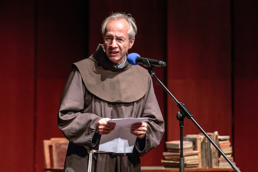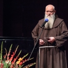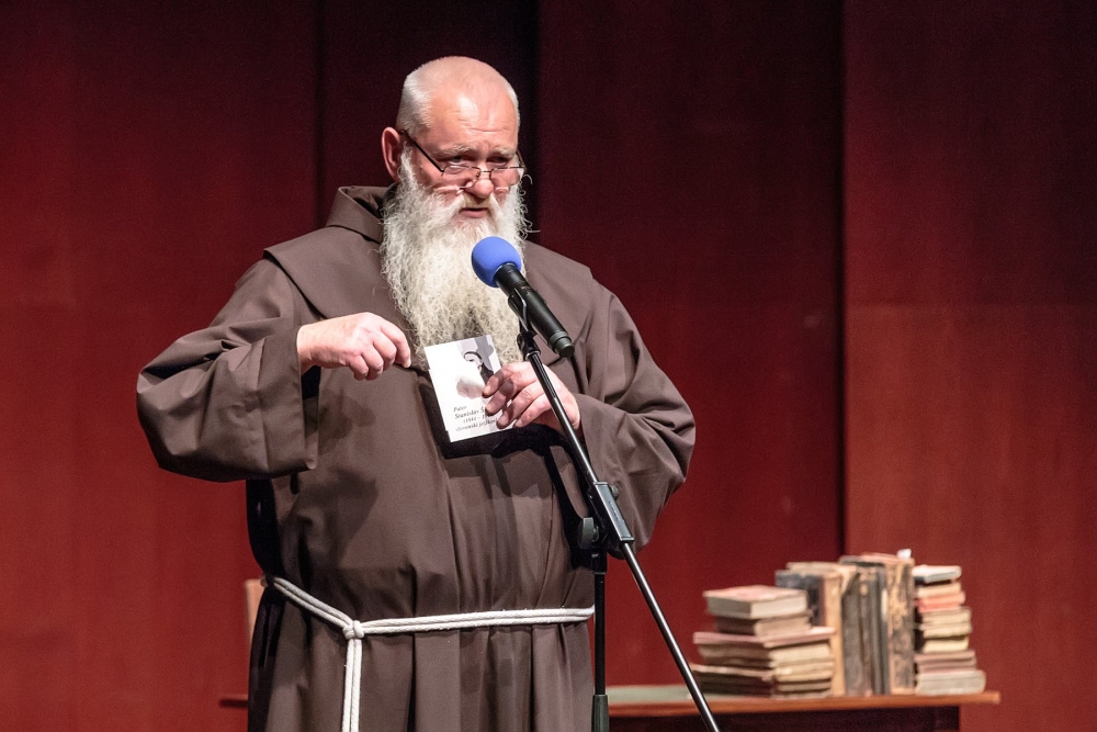 Prepričan sem, da so se tako bratje tudi pred sto leti tako poslovili od svojega sobrata, frančiškovega brata, od svojega so-duhovnika in ne nazadnje od velikana, učenjaka, majhnega po postavi, pa velikega po ustvarjalni moči. Iz vsega srca bi rad vas vse pozdravil, ponosen, da bivamo v samostanu, kjer je p. Stanislav Škrabec 42 let skrbel za svoje notranje frančiškovo življenje in ker je, in zaradi tega smo danes tukaj, skrbel za lep slovenski jezik. Zaradi prvega in drugega smo ponosni, smo veseli. In tudi sam zato iskreno izražam srčno hvaležnost, vsem, ki ste karkoli prispevali, da je od leta `93 lahko ena majhna znamka sprožila vse to valovanje do današnjega dne, ko lahko rečem mirne duše: danes je praznik slovenskega jezika.